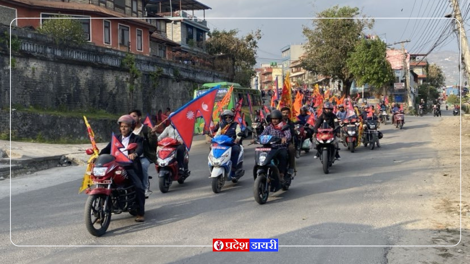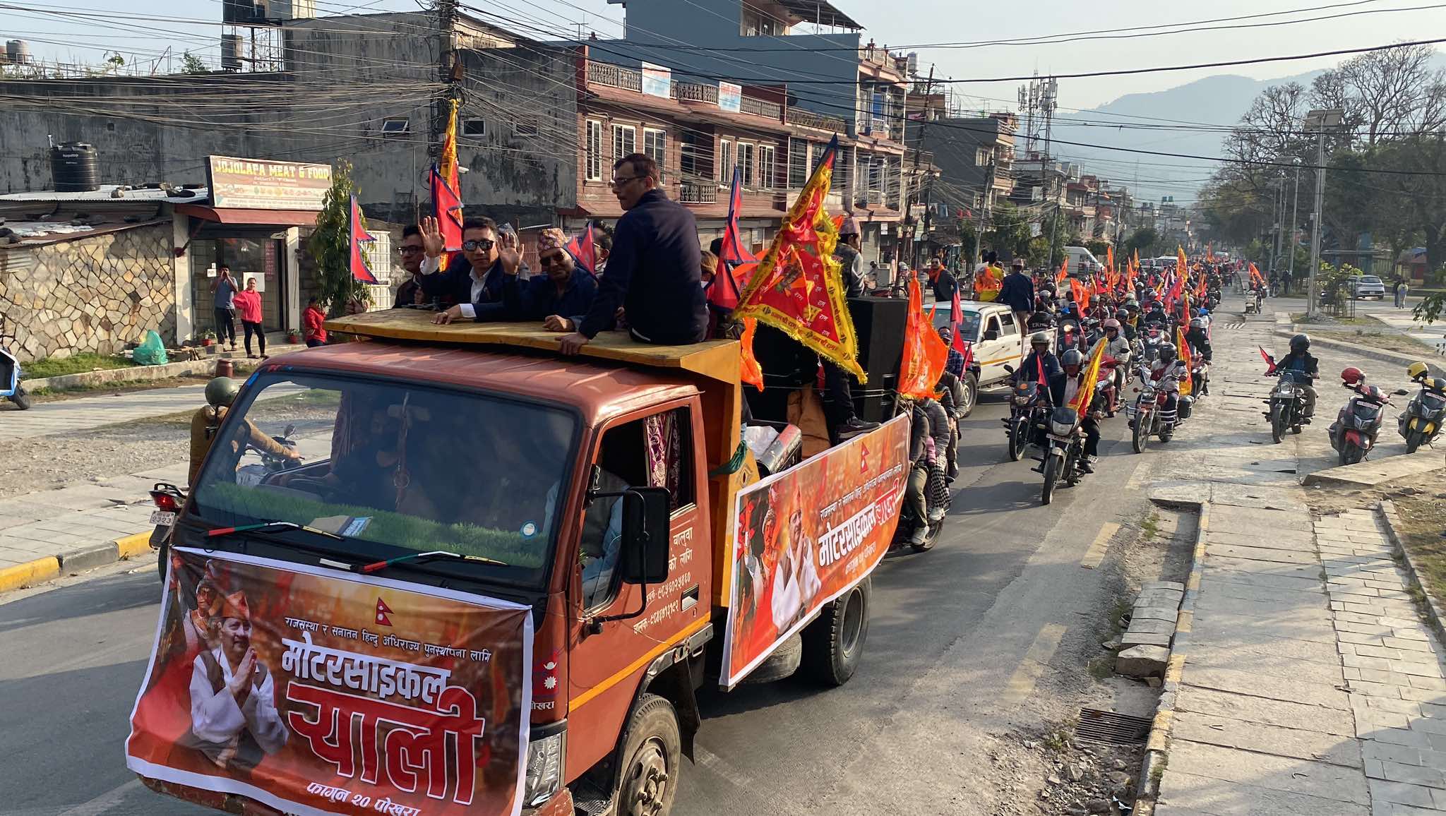 पोखरा । राष्ट्रिय प्रजातन्त्र पार्टी (राप्रपा)ले मंगलबार पोखरामा मोटरसाइकल र्याली गरेको छ । हिन्दु राष्ट्रको पुनर्स्थापना संघीयताको खारेजी भ्रष्टाचारको अन्त्य लगायतको विषय माग राखी मोटरसाइकल निकालेको हो । आन्दोलन परिचालन समितिको ब्यानर भएको उक्त र्यालीमा राजावादीहरूको उल्लेख्य सहभागिता रहेको थियो । सो क्रममा राजावादीहरूले राजसंस्थाको पक्षमा चर्को नाराबाजी गरेका थिए ।