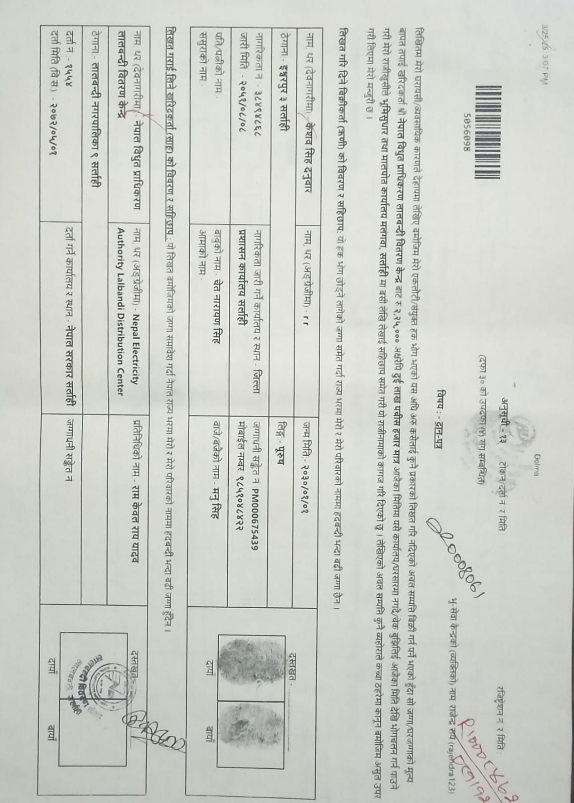 सर्लाही : सर्लाहीको ईश्वरपुर नगरपालिका – ७ निवासी केसव सिंहले नेपाल विद्युत प्राधिकरण, लालबन्दी वितरण केन्द्रलाई फ्यूज सेवा सञ्चालनका लागि करिब ६० लाख रुपैयाँ मूल्य बराबरको ३० धुर जमिन दान गरेका छन् । सिंहले विद्युत विकासमा योगदान दिने उद्देश्यले उक्त जमिन प्रदान गरेको बताएका छन् ।